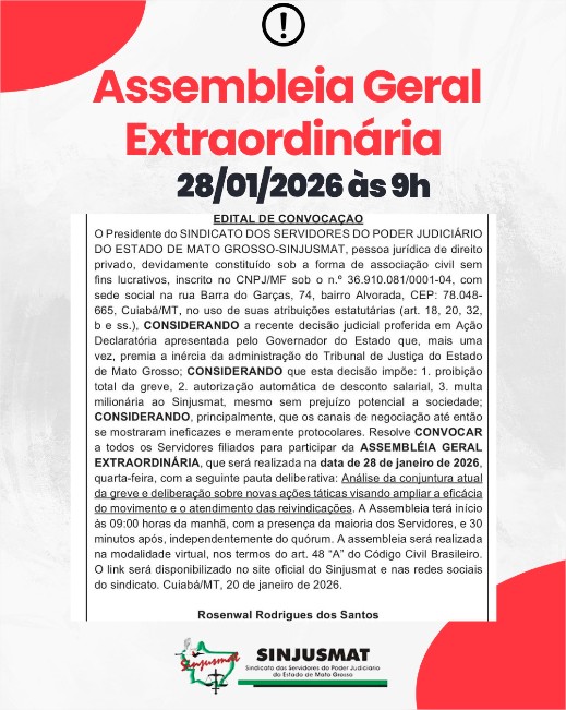 Servidores do Judiciário de Mato Grosso entram em greve a partir de 21 de janeiro por desvalorização e descumprimento de compromissos Os servidores e servidoras do Poder Judiciário de Mato Grosso decidiram, em Assembleia Geral Extraordinária convocada pelo SINJUSMAT, deflagrar greve a partir do dia 21 de janeiro de 2026.