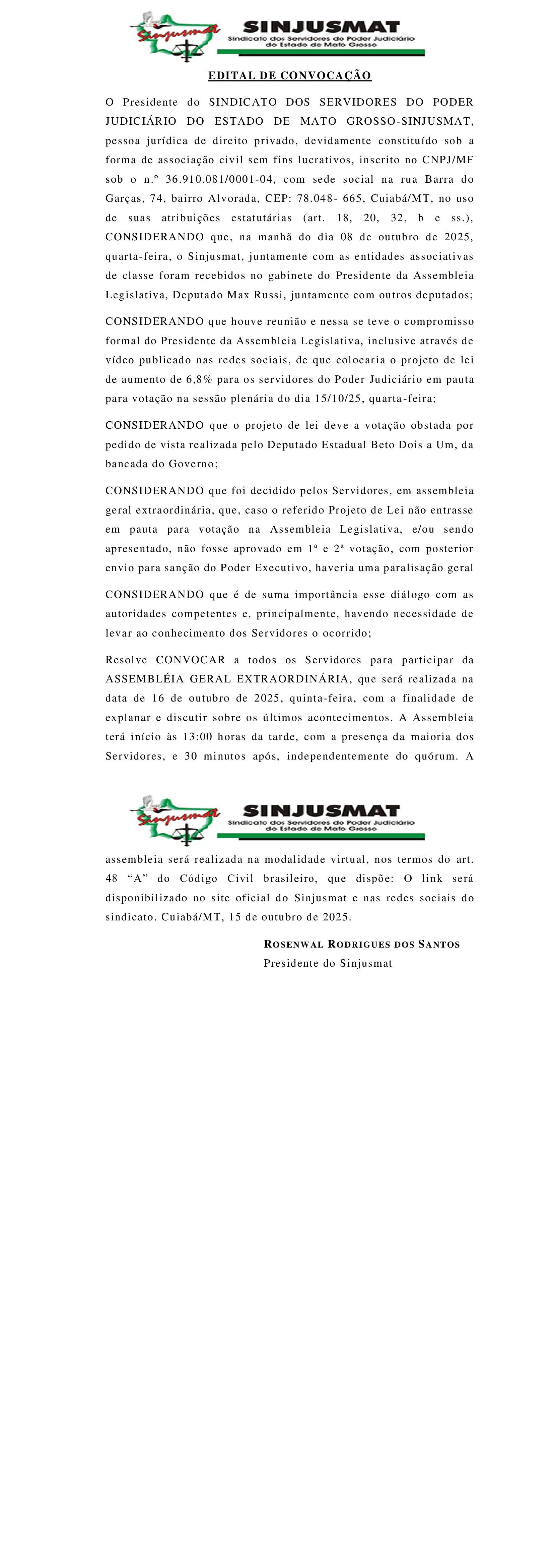 Neste dia 17/7/2025 o SINJUSMAT realizou Assembleia Geral Extraordinária virtual em cumprimento a Determinação Judicial proferida nos autos da Ação trabalhista (PJE) n. 0000440-31.2025.5.23.0009. Após as tratativas, os resultados foram os seguintes nas deliberações: O Sinjusmat deve dar continuidade às negociações com a Administração do TJ e CNJ para garantir a implementação do direito ao Adicional de Tempo de Serviço (ATS); Foi aceita a proposta apresentada pela Administração do Tribunal de Justiça: aumento de 1% por nível na progressão vertical das tabelas de subsídio de cada Servidor; Retorno às tratativas do SDCR proposto pelo Comitê Gestor e previsto na LOA do ano 2024/2025; Suspender o Estado de Greve. Veja abaixo os resultados por tema na ordem acima apresentada: